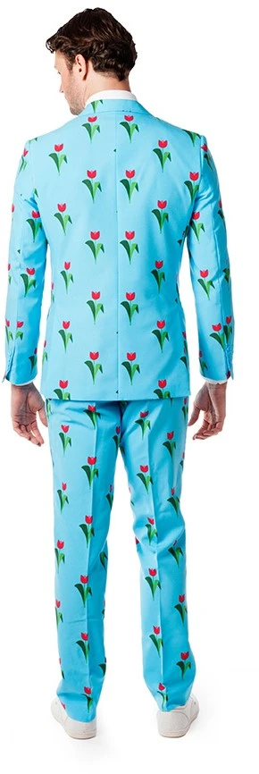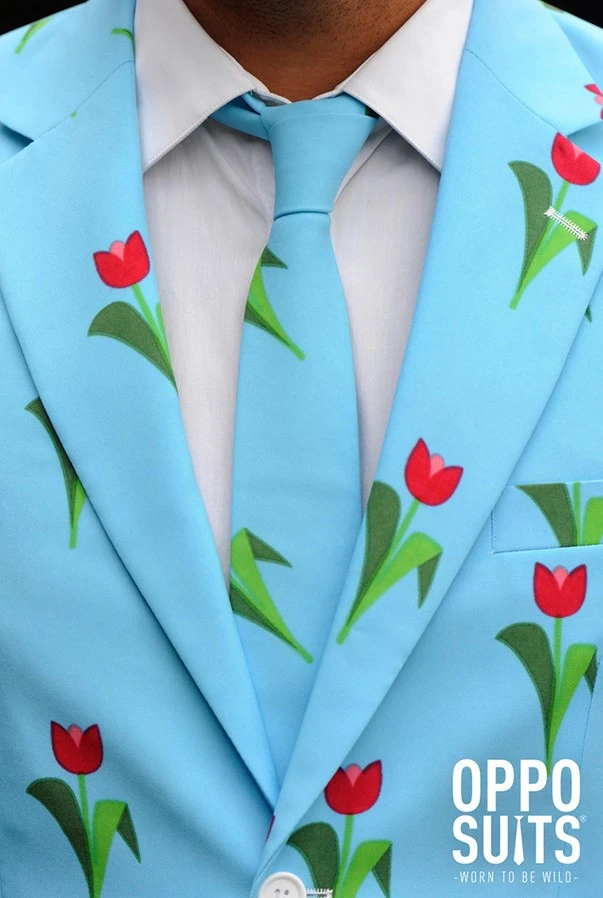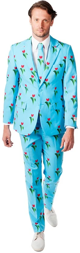 Laat je roots zien in dit gave maatpak met een patroon van tulpen! De luchtblauwe basis in combinatie met de tulpen maakt dit pak erg tof. De tulp is natuurlijk hét bekendste exportproduct van Nederland is bekend over de hele wereld.