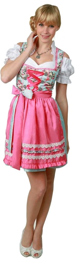 Deze mooie 2 delige Dirndl in de kleuren lichtblauw en pink met een multi gekleurde bloemenmotief. Geschrikt voor een mooie dag op een Oktoberfest.