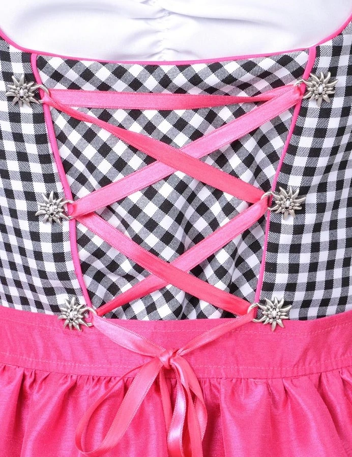 Details: geblokte bovenzijde en veel leuke details en een pink kleurig schort