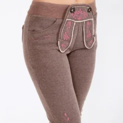 Deze van joggingstof gemaakte lederhose voor dames ziet er niet alleen erg stoer uit, maar zit ook nog eens comfortabel. De lederhose is ook verkrijgbaar in het grijs, een korte variant (in beide kleuren) en voor heren (ook beide kleuren).