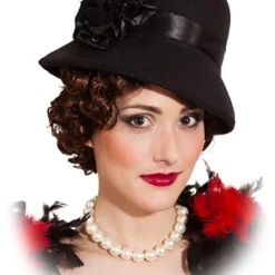 Van plan om een charleston kostuum aan te schaffen? Deze dameshoed charleston luxe past er perfect bij. De hoed heeft een vilt-uiterlijk met een satijnen lint en een grote zwarte roos van satijn en tule aan de zijkant. Gemaakt van 100% polyester.