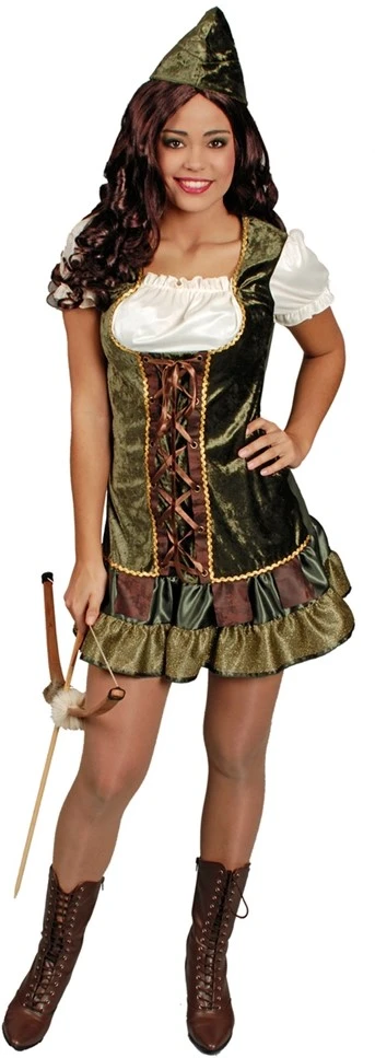 Wordt een echte vrouwelijke Robin Hood met dit dameskostuum! Dit groene Dameskostuum Robin Hood heeft aan de voorkant bruine details zoals een bruine gekruisde koord. Ook zit er rondom de hals een gouden detail. De witte mouwen zitten aan het jurkje vast en wordt er met het jurkje het afgebeelde hoedje geleverd. Dit Dameskostuum Robin Hood is gemaakt van 100% polyester en bestaat uit: