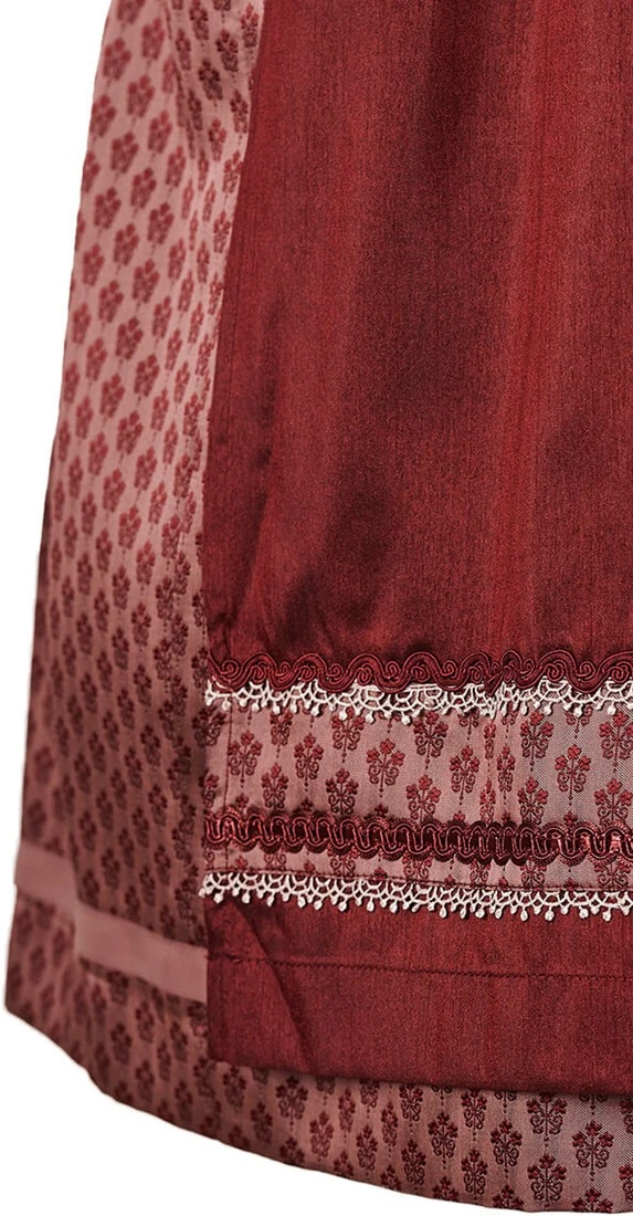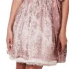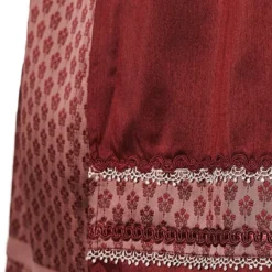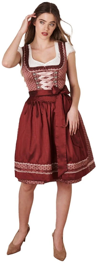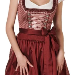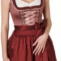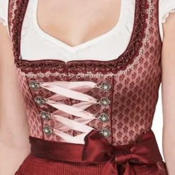 Details dirndl: rechte halslijn versierd met ruches, kant en miederhaakjes met strass en steentje en een satijnen lint