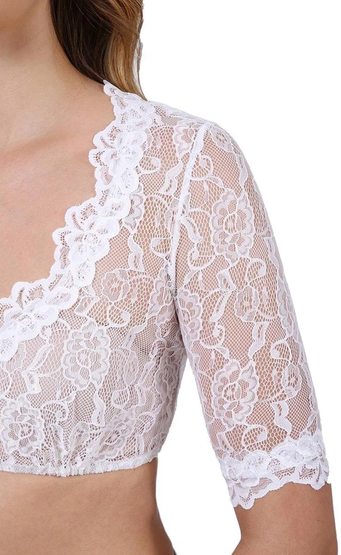 Details: transparant kant met versieringen op de V halslijn om het decolleté benadrukken en half lange mouwen