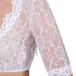 Details: transparant kant met versieringen op de V halslijn om het decolleté benadrukken en half lange mouwen