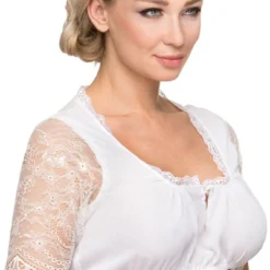 Een witte dirndl blouse met kant aan de mouwen en bij de hals. Aan de voorkant zit een knoopje met hierin een diamantje verwerkt. De blouse is gemaakt van 100% polyester.