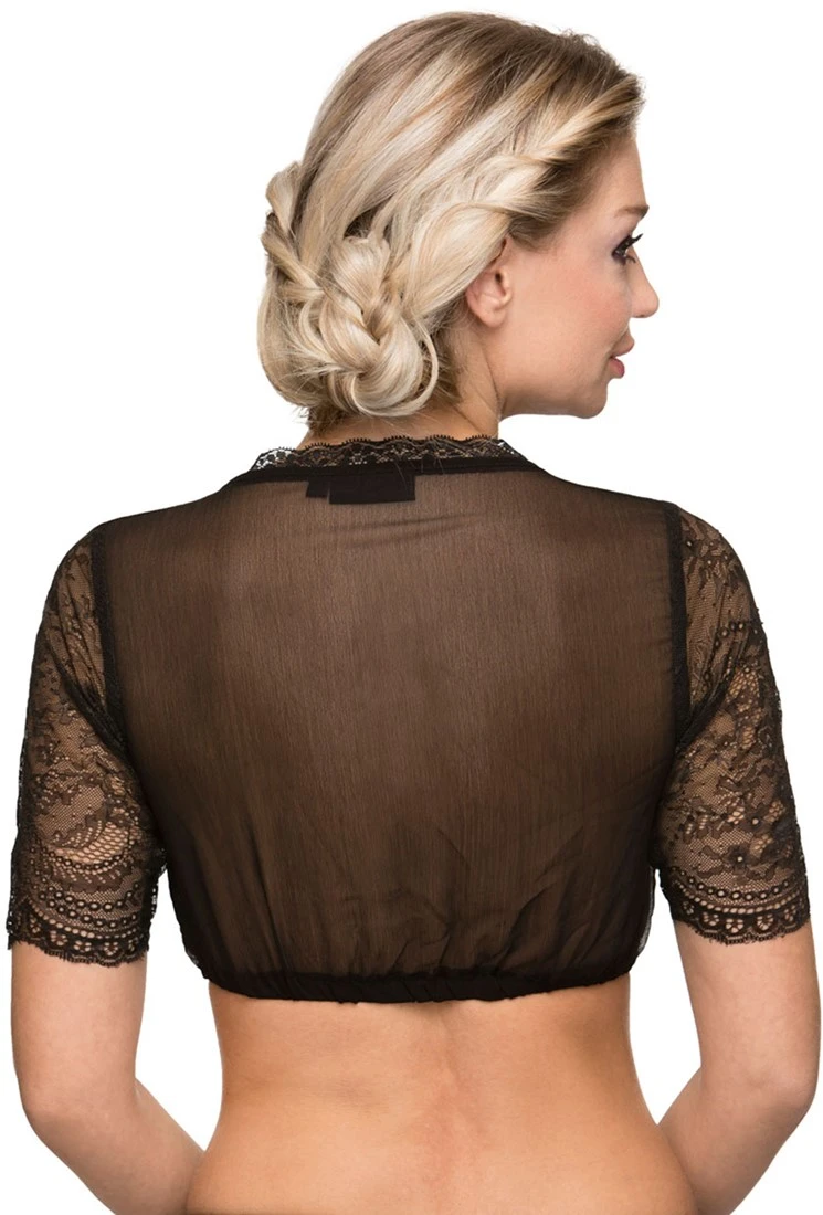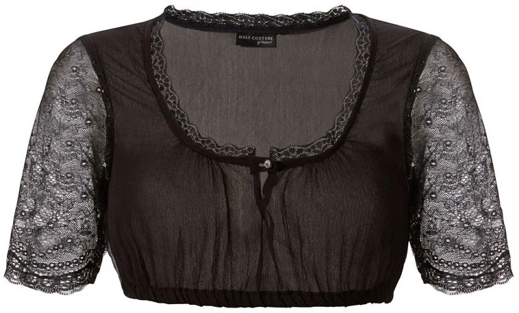 Een zwart dirndl blouse met kant aan de mouwen en bij de hals. Aan de voorkant zit een knoopje met hierin een diamantje verwerkt. De blouse is gemaakt van 100% polyester.