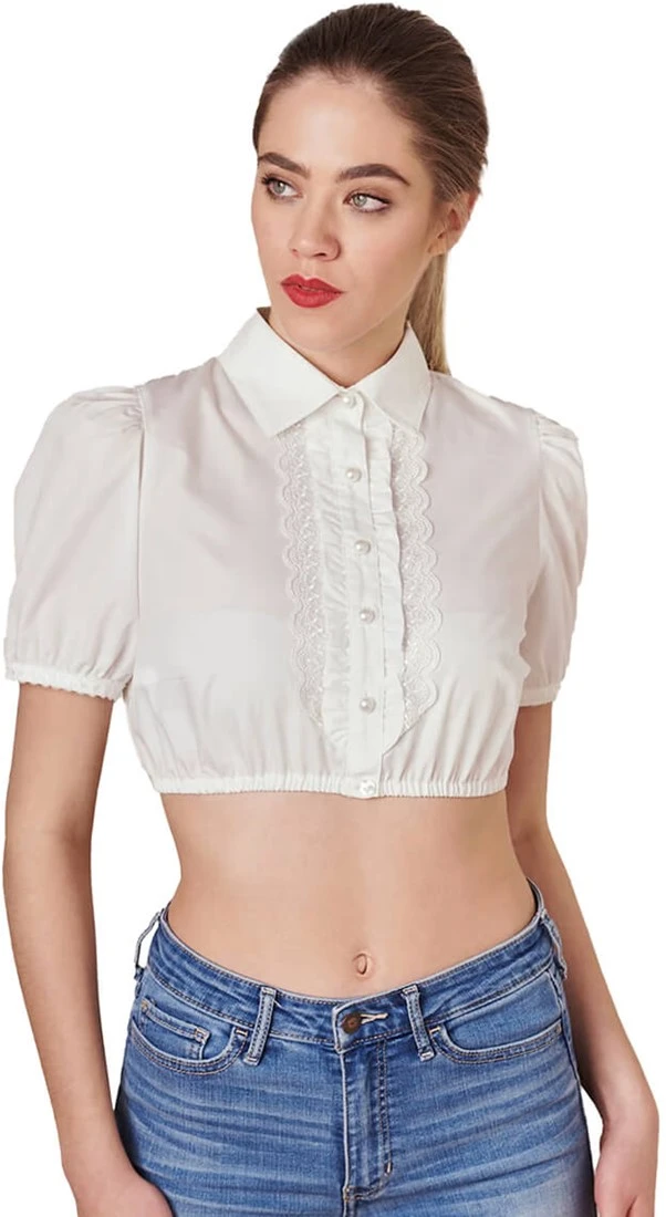 Details: hoog gesloten en korte pof mouwen. De voorkant is afgewerkt met ruches, biesjes en een parelknoopband