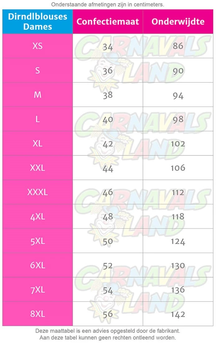 | Dames confectie | 36 = S, 38 = M, 40 = L, 42 = XL, 44 = XXL, 46 = 3XL, 48 = 4XL, 50 = 5XL, 52 = 6XL |