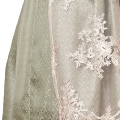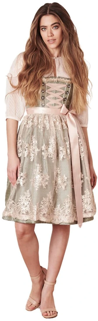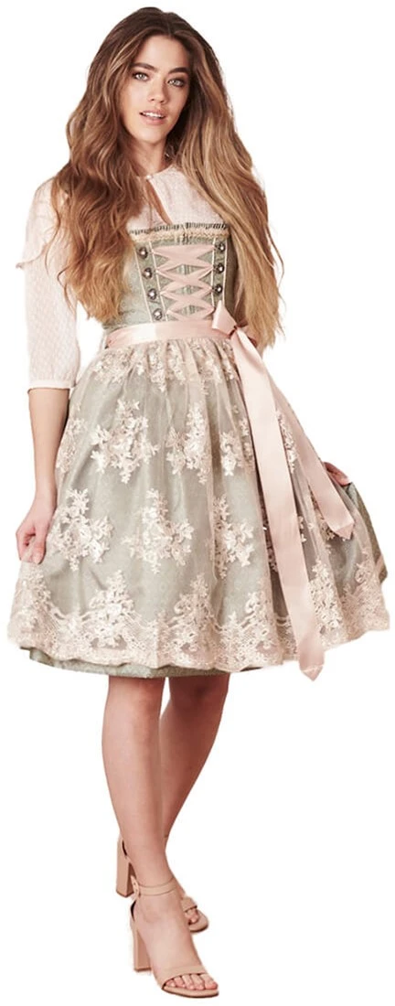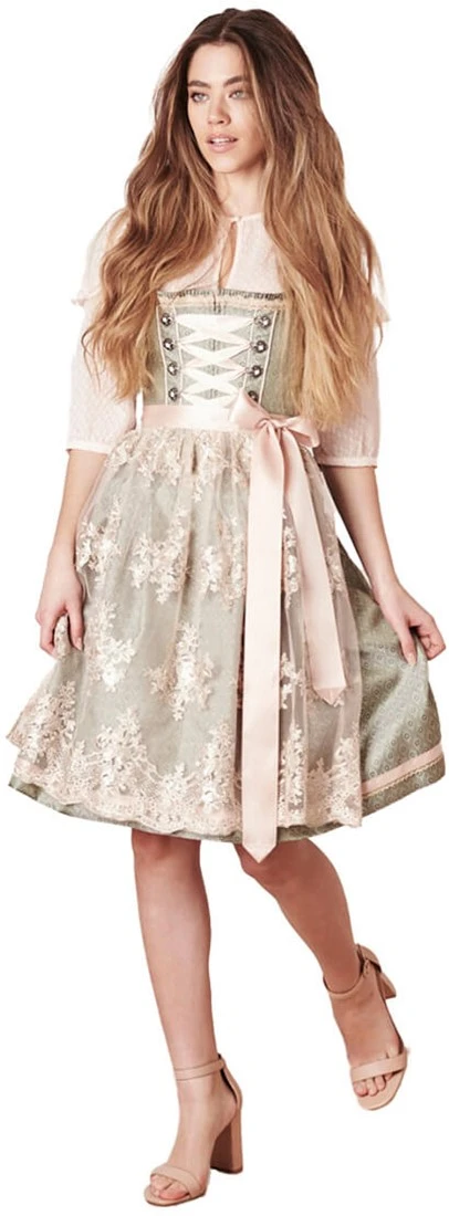 Details dirndl: uitgebreide randen langs een rechte halslijn en lijfhaakjes met strass