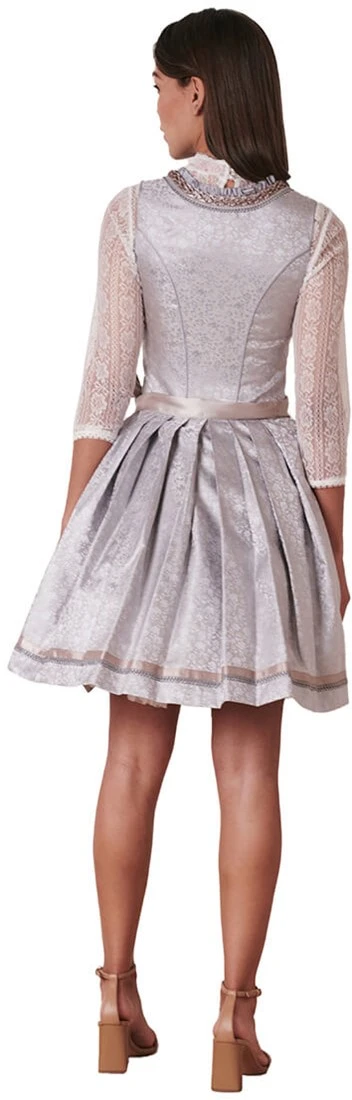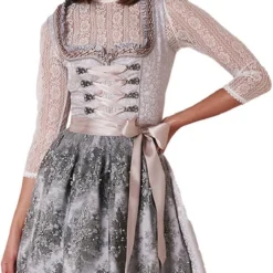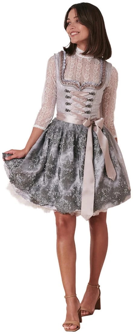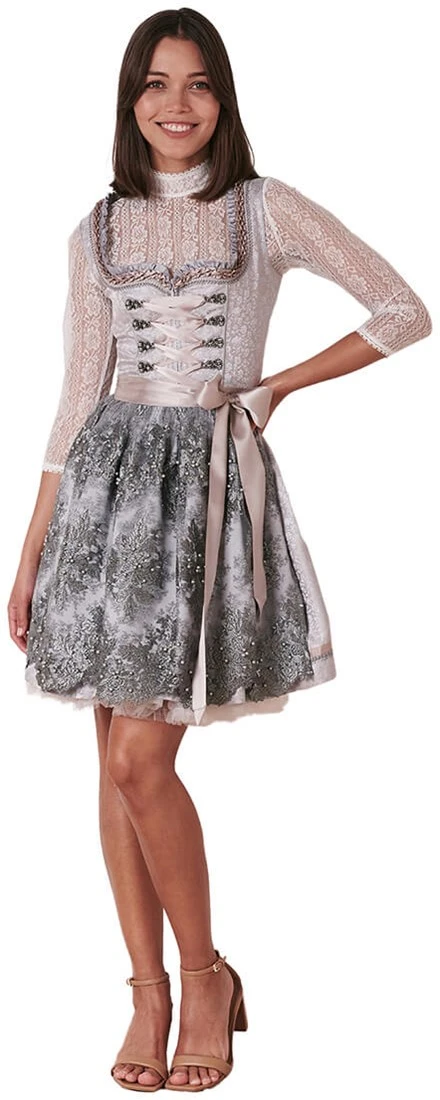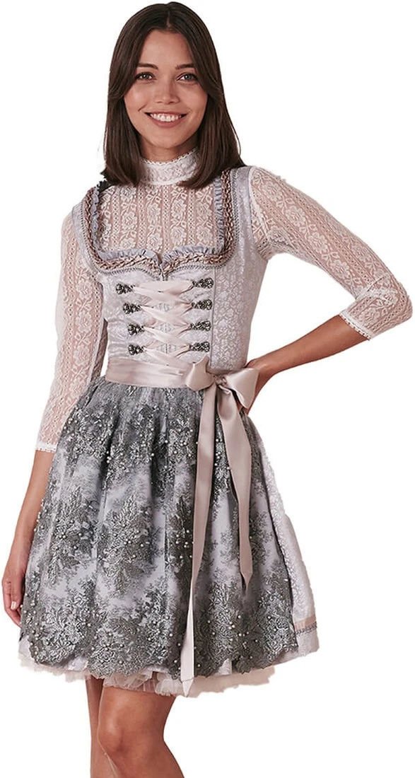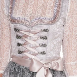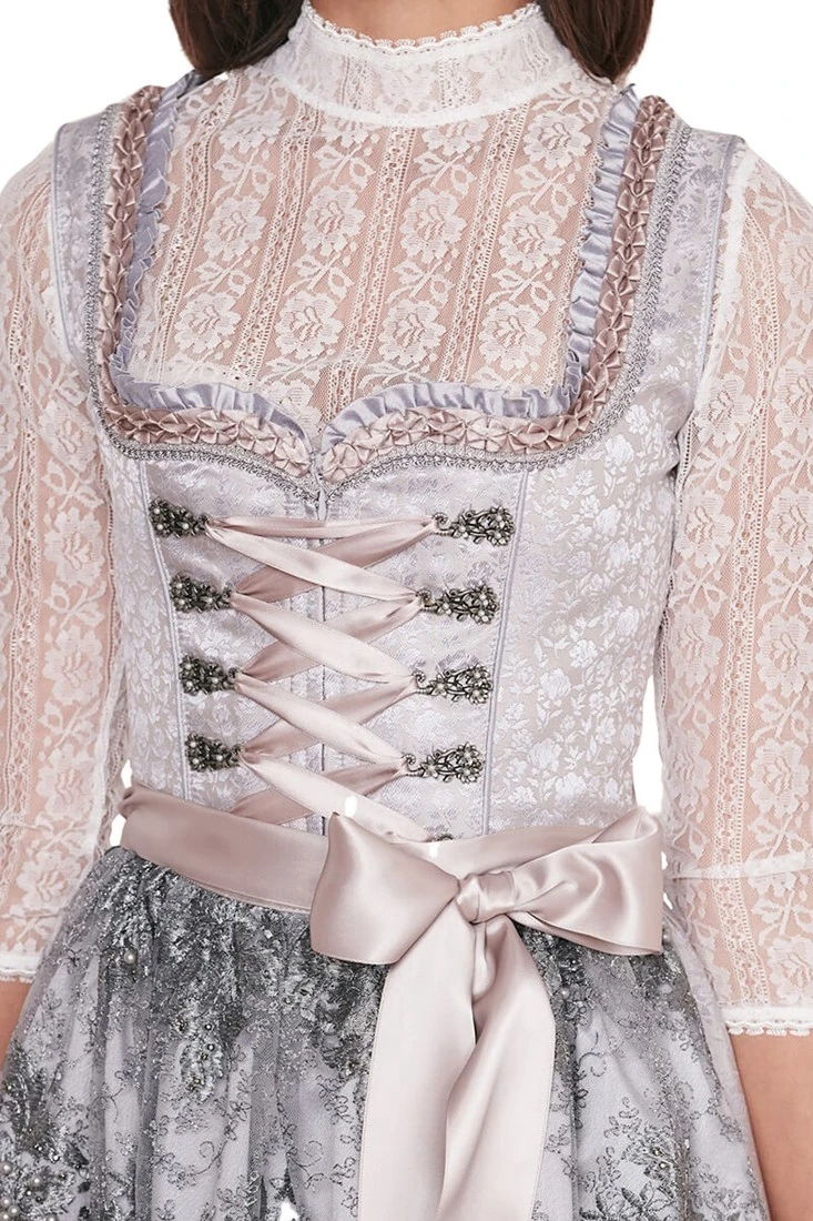 Details dirndl: uitgebreide randen langs een hartvormige halslijn en miederhaakjes met parels