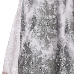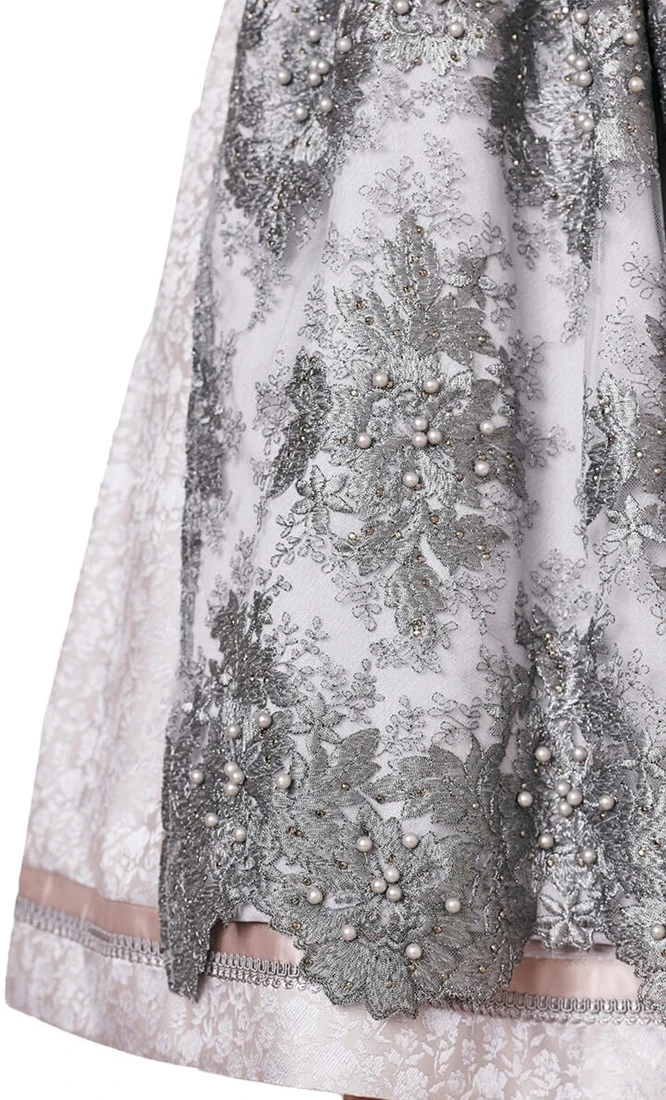 Details schort: 2 lagen, de bovenlaag is transparant met bloemen borduurwerk, parels en studs