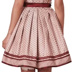 Details dirndl: hartvormige halslijn versierd met ruches, miederhaakjes met strass en steentje en een satijnen lint