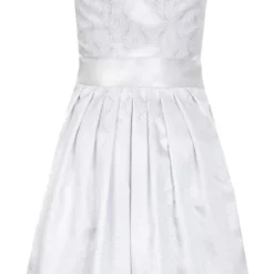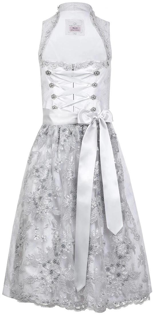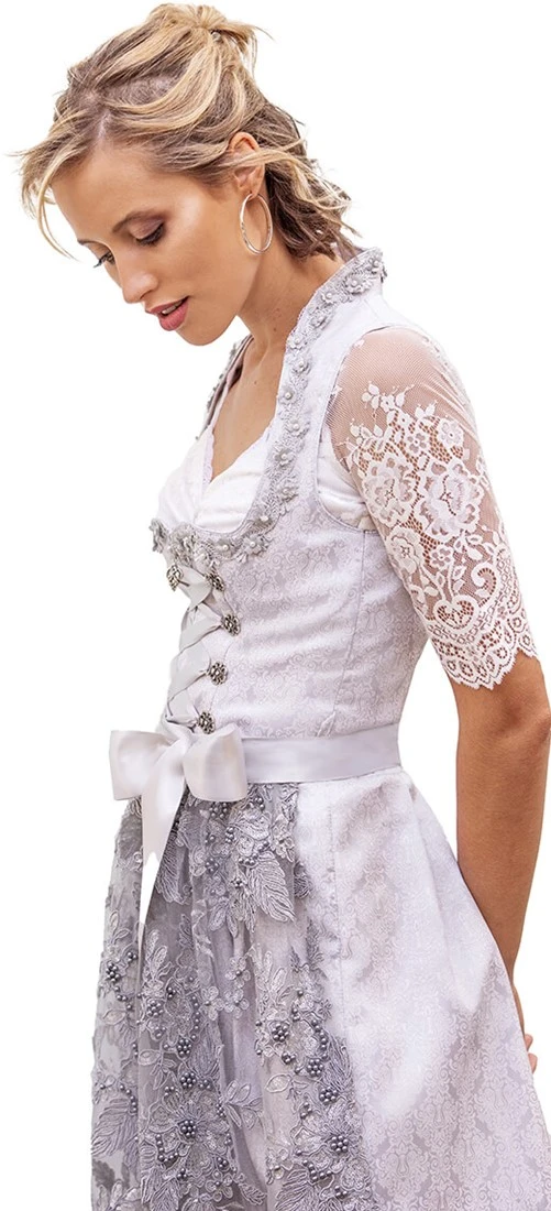 Details: hartvormige halslijn versierd met kanten band met bloemen en parels. Door de miederhaakjes met strass een satijnen lint