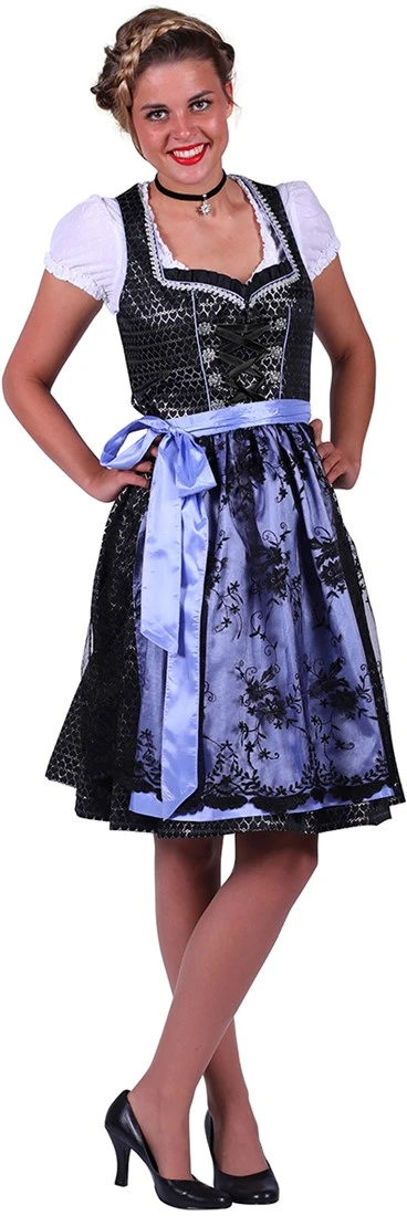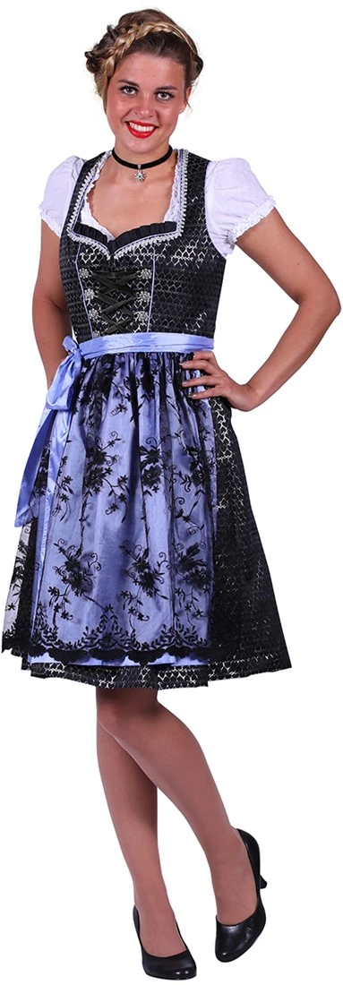 Een prachtige dirndl met een zwarte basis, in combinatie met zilveren en Korenbloemblauwe accenten. Met deze jurk val je zeker op bij elk oktoberfest.