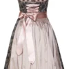 Deze leuke dirndl heeft een zwarte/rood kleurenpatroon, met een zwarte bovenkant en rood/wit geblokte rok. Onder het decollete zitten metalen gepen met daardoorheen een rood lint. Daarboven en bij de hals is de jurk afgewerkt met een sierlijke satijnen band. Het rode schort is van satijn en maakt de dirndl helemaal compleet. De witte dirndlblouse is aan de randen afgewerkt met een soort van kant.