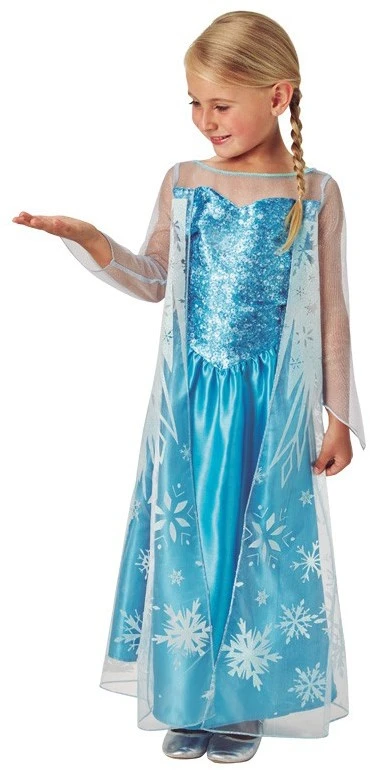 Wil jij verkleed gaan als Elsa uit de film Frozen? Met deze prinsessenjurk wordt jij een echte prinses! De blauwe jurk heeft een tule laag met lange mouwen en is bedrukt met sneeuwvlokken. Aan de bovenkant van de tule laag zit een glitterlaag waarbij de sneeuwvlakken doorzichtig zijn. Aan de onderkant van de tule laag is dat juist omgekeerd. Daar zijn de sneeuwvlokken met glitter bedrukt op de tule laag. Verder zit er aan de voorkant van de kraag lijn met pailletten. De Frozen Prinsessenjurk Elsa Classic is gemaakt van 100% polyester.