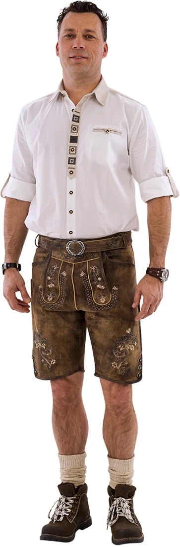 Een fraaie trachten lederhose voor heren, met opgedrukte (fijn geborduurde) details en Hirschhorn-knopen. De broek wordt inclusief de riem geleverd, die een oud-zilveren gesp aan de voorkant heeft. Deze eikenbruine lederhose is gemaakt van echt geitenleer en heeft steekzakken aan de zijkant en in het midden.