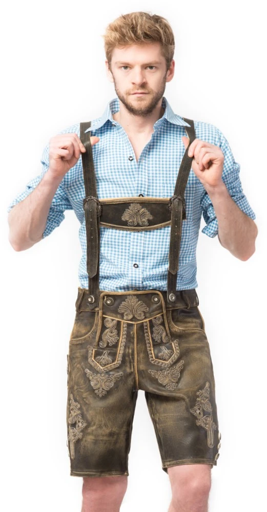 Deze fraaie grijze lederhose is versierd met mooie grote patronen. Een blikvanger op een oktoberfest.