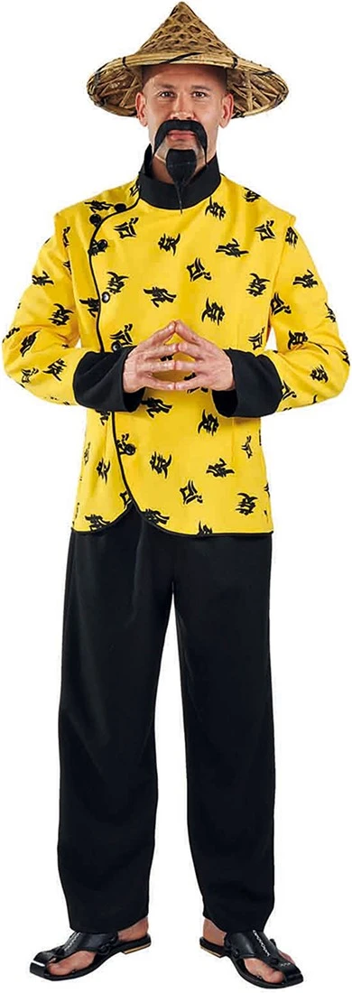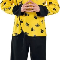 Details bovenstuk: over het hele bovenstuk zitten chinese tekens en zijn de uiteindes van de mouwen mouwen en kraag effen zwart