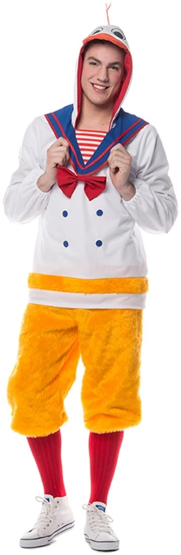 Eenden kostuum voor heren, bestaande uit een broek van pluche, en een bovendeel met capuchon. Bijpassend damesjurkje ook verkrijgbaar.