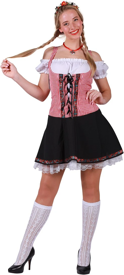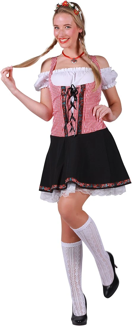 Patroon bovenstuk: is rood/wit geblokt met aan de voorzijde een gekleurde band