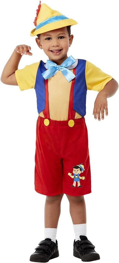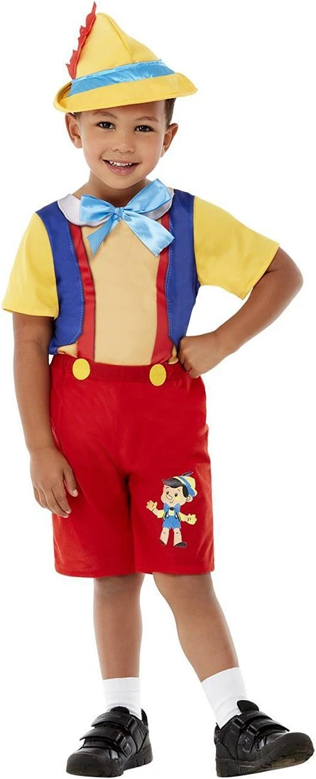 Details: geel shirt met vast gilet en bretels, rood broekje met een afbeelding van pinokkio erop
