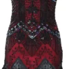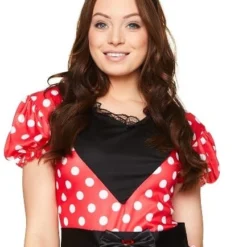 Details jurk: op de borst een diepe decolleté met daar achter een zwarte stof wat is afgewerkt met kant. Korte pof mouwen en een geplooide rok