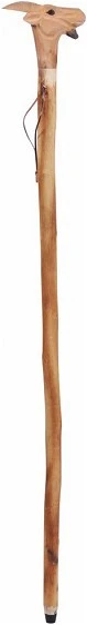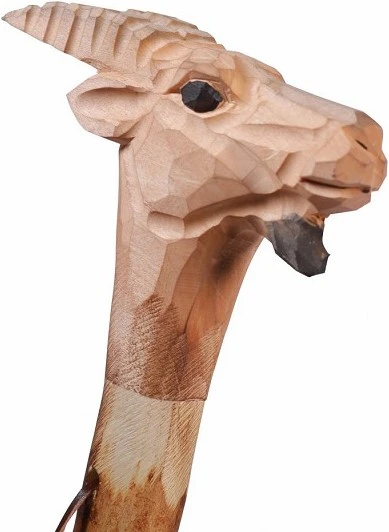 Deze wandelstok is gemaakt van natuurlijk hout met een uit hout gesneden geitenkop erop.