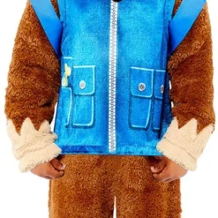 Details jumpsuit: de armen en benen zijn van pluche stof. Op het bovenlijf is een vest afgebeeld met zakken, rits en sterren