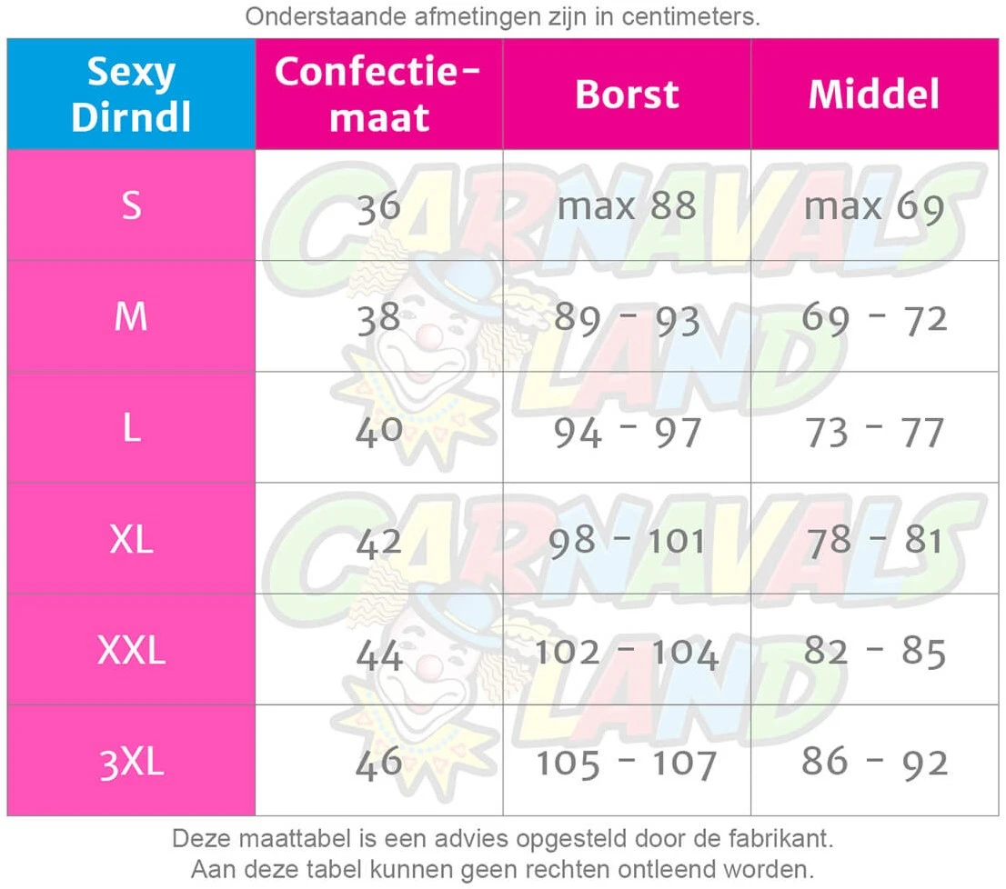 | Dames confectie | 36 = S, 38 = M, 40 = L, 42 = XL, 44 = XXL, 46 = 3XL |