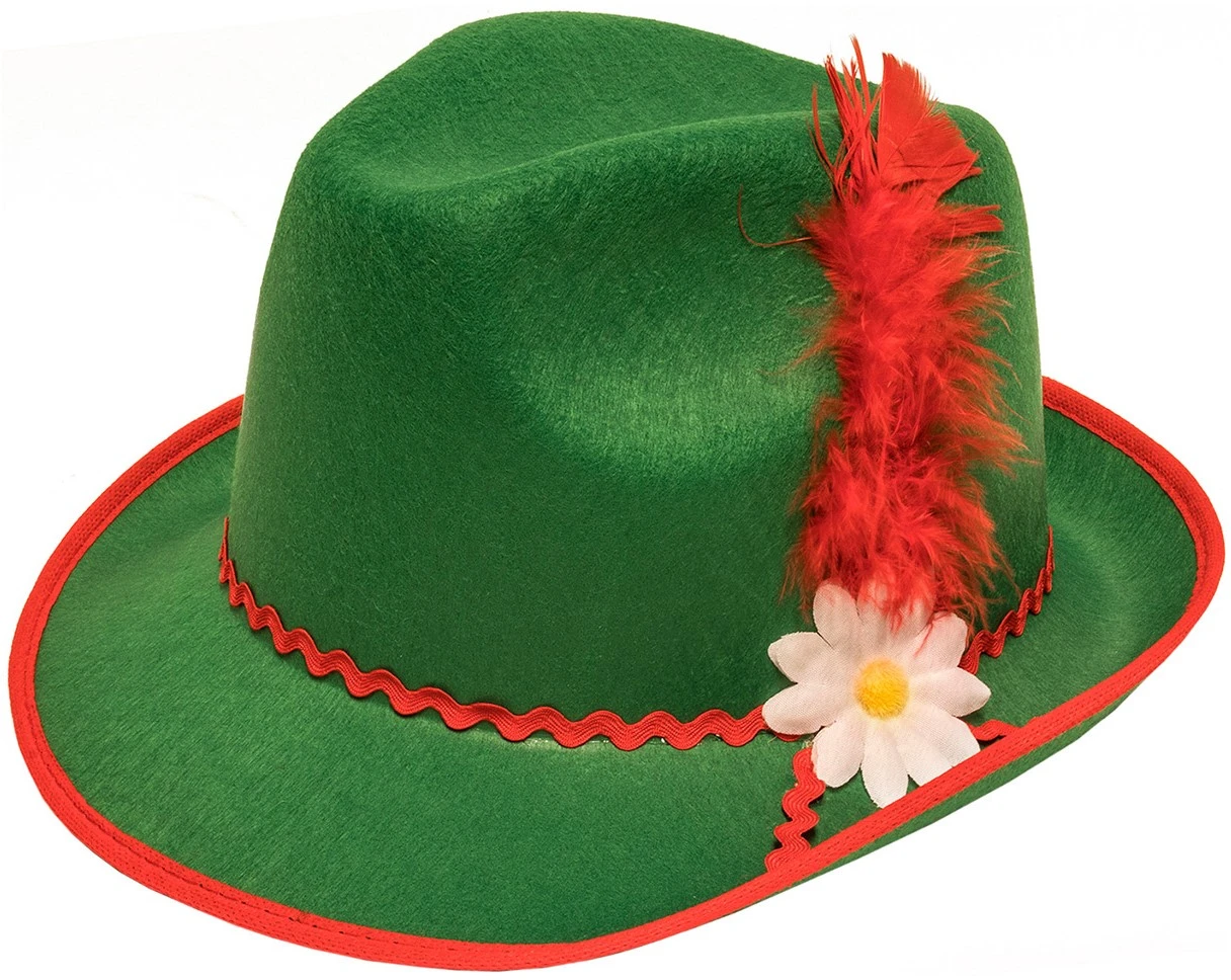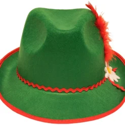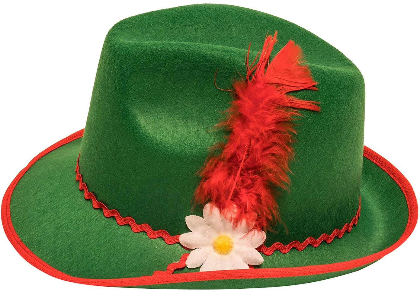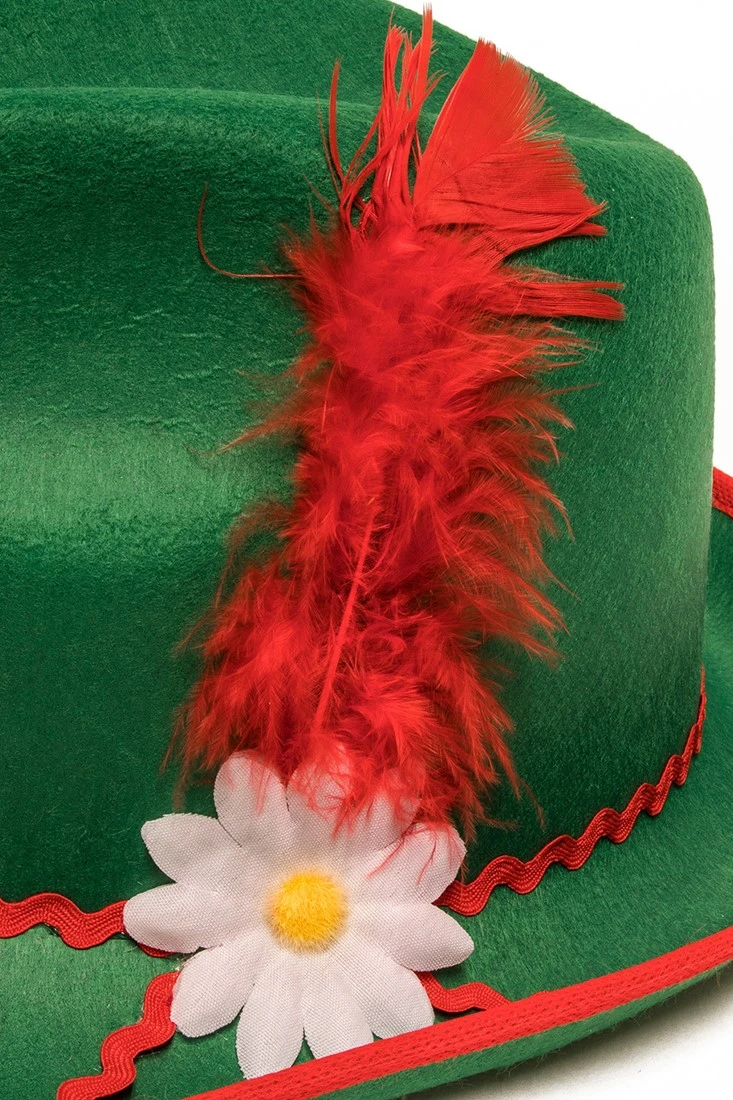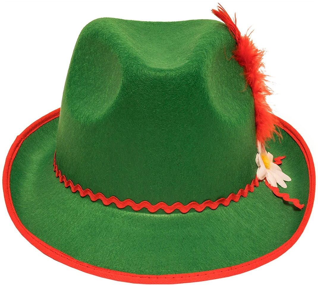 Een groene Tiroler hoed, leuk voor Tiroler feestjes of bijvoorbeeld een Oktoberfest. Gemaakt van polyester.