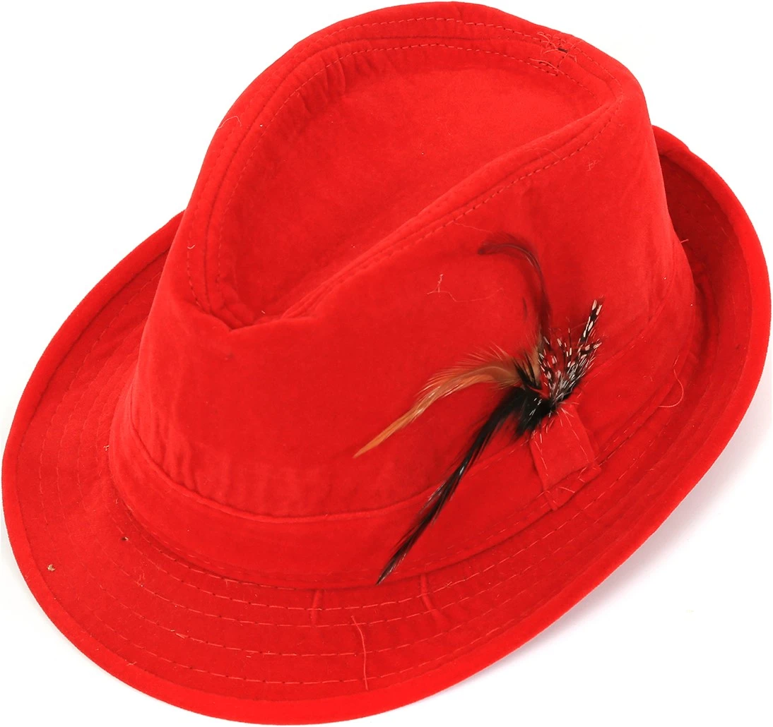 Details: rode tiroler hoed met aan de linkerkant 4 verschillende kleuren veertjes