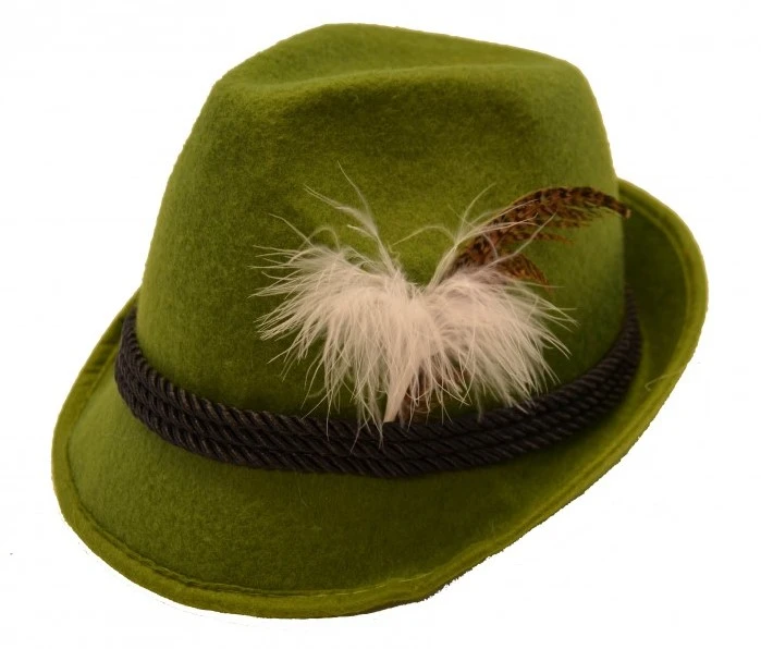 Leuk olijfgroen jagershoedje met zwarte band en veertje. Een stevige Tiroler hoed, gemaakt van vilt stof.
