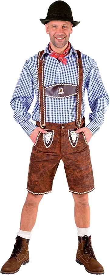 Een bruine Tiroler broek voor heren met sierlijke ecru gekleurde lijnen. Deze Tirolerhose is versierd met een aantal details. Het middenstuk van de bretels en en de twee details bij de gordel zijn gemaakt van skai (nepleer) voor een leuk effect. Op het middenstuk van de bretels zit een afbeelding met een hert en de tekst “Alm Hirsch”. Ook verkrijgbaar in het zwart.